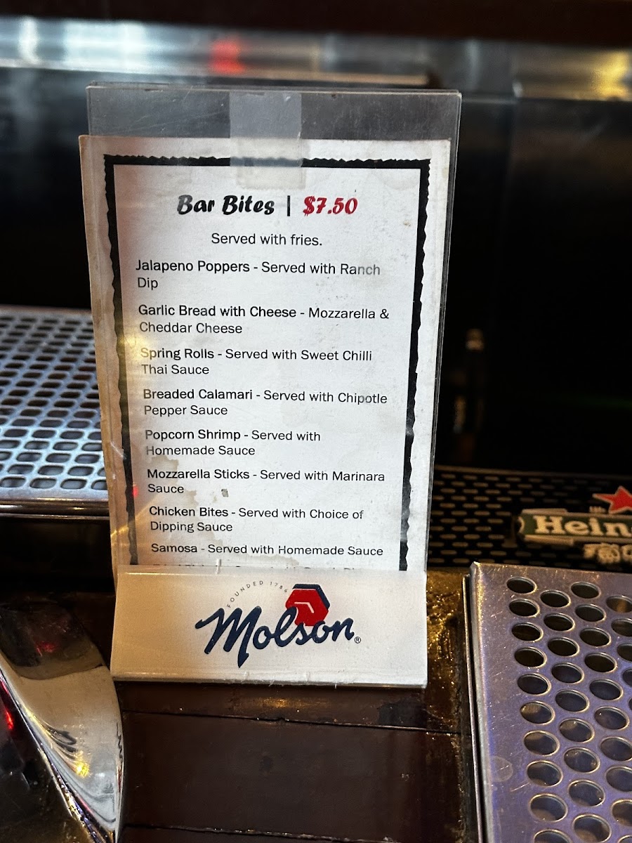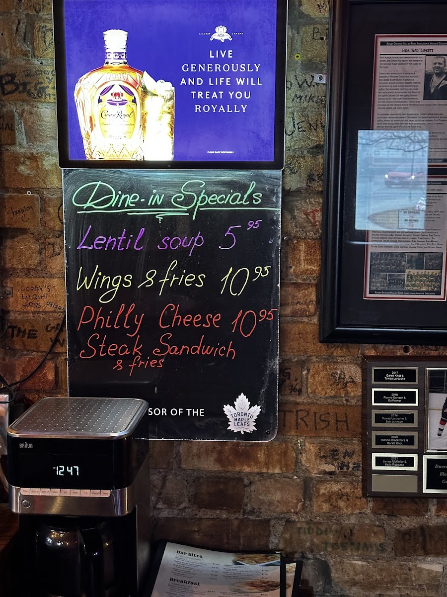 This is a small local pub. Our group had the pizza, soup of the day, hamburger, and beef quesadillas. The food is amazing and very reasonably priced. TV's to watch the game (unfortunately the Leafs lost). All round great place to eat, have a beer or 2 and enjoy.